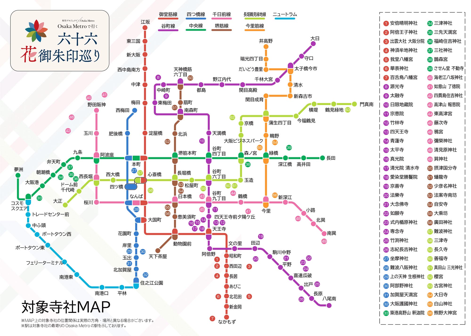 【ご応募締め切りについて】LINE・郵送・WEB応募:2025年12月31日(水)まで御朱印帳持ち込み応募:2026年1月30日(金)ご予約分まで ※延長しました詳細はこちら→ English 最新情報 [12月10日更新]記念品応募に関するご案内❀ ※12月10日更新情報 [LINE/WE […] 詳しくはこちら→ [11月26日更新]重要:各寺社に関するご案内 平素より「Osaka Metro花御朱印 […] 詳しくはこちら→ 【10月16日更新】 「奉納花手水」イベントスケジュール❀ ❀リンクフラワーで彩る「奉納花手水」❀イ […] 詳しくはこちら→ 最新情報一覧はこちら フォトコンテスト開催中 詳しくはこちら 特別 花御朱印について イベント期間限定の花がテーマの特別御朱印です。 期間中にしか手に入らない「特別 花御朱印」を授与いたします。お花をモチーフにした華やかな御朱印です。さらに、季節に合わせた特別仕様もご用意!その時期ならではの風情を感じられる「特別 花御朱印」をお楽しみください。 ※「特別 花御朱印」の授与には、「専用御朱印帳」の提示と別途御朱印授与料が必要です。また「特別 花御朱印」は書き置きでの対応です。 参加方法 リンクフラワーで彩る「奉納 花手水」 「奉納 花手水」は、花御朱印巡りと全国のフラワーショップや営業拠点を構える日比谷花壇グループのコラボレーションにより実施します。様々な事情により、フラワーショップの店頭に並べることができなかった美しい花「リンクフラワー」※を、お寺・神社の手水舎に使用した「奉納 花手水」として活用します。この取り組みを通して、花を身近に感じてもらうとともに、花を育てる生産者や花業界の想いを無駄なく生かす活動に参加する機会になればと考えています。※「リンクフラワー」は、生産者が花に込めた想いをお客様に「リンクする(つないでいく)」ことを目指して、日比谷花壇グループが名付けました。 専用御朱印帳販売場所 ●Osaka Metro駅構内 ローソン売店の一部店舗●定期券発売所 (梅田駅/なんば駅/天王寺駅)●Osaka Metro 案内カウンター (新大阪駅)※販売場所は変更になる場合があります。販売場所、定休日、営業時間などは公式WEBサイトをご確認ください。 ※定期券発売所での販売は2025年3月21日(金)〜4月18日(金)を除きます。 ●花御朱印巡り公式オンラインストア ご購入はこちら ご利益をクリックすると対象のお寺・神社を検索できます。 心願成就 健康運・長寿 良縁・恋愛成就 学業成就・技芸向上 厄除け・開運 金運向上・商売繁盛 福の神 「特別 花御朱印」を集めて、満願記念品を手に入れよう! 満願記念品の詳細・応募方法はこちら 対象のお寺・神社一覧(全66寺社) 路線名をクリックすると対象のお寺・神社を検索できます。 御堂筋線 安倍晴明神社・阿倍王子神社・出雲大社 大阪分院・神須牟地神社・我堂八幡宮・華表神社・百舌鳥八幡宮 谷町線 源光寺・太融寺・日限地蔵院・宗恵院・竹林寺・ 四天王寺・青蓮寺・太平寺・真光院・清光院 清水寺・愛染堂勝鬘院・京善寺・法樂寺・大念佛寺・如願寺・式内楯原神社・専念寺・竹渕神社・志紀長吉神社 四つ橋線 坐摩神社・難波八阪神社・上の天神 生根神社・阿部野神社・加賀屋天満宮・大阪護國神社 中央線 築港高野山 釈迦院・三津神社・三先天満宮・福崎住吉神社・三社神社・鵲森宮・させん堂 不動寺 千日前線 海老江八坂神社・如意山 了徳院・四貫島住吉神社・高津山 報恩院・東高津宮・藤次寺・鴉宮・彌榮神社・清見原神社・巽神社 堺筋線 摂津国分寺・蟠龍寺・少彦名神社・法案寺南坊・自安寺・大乘坊・廣田神社 長堀鶴見緑地線 難波神社・三津寺・長久寺・善福寺・真田山 三光神社・櫻宮・古宮神社 今里筋線 大日寺・白山神社・熊野大神宮 対象のお寺・神社一覧