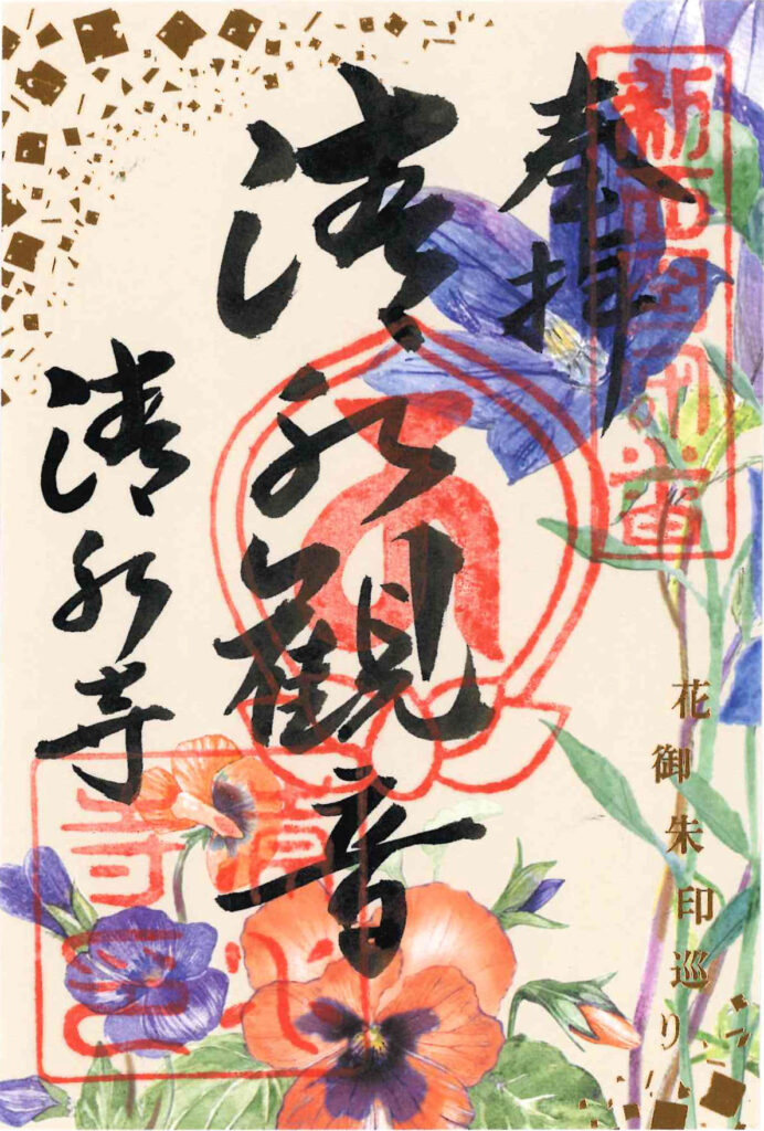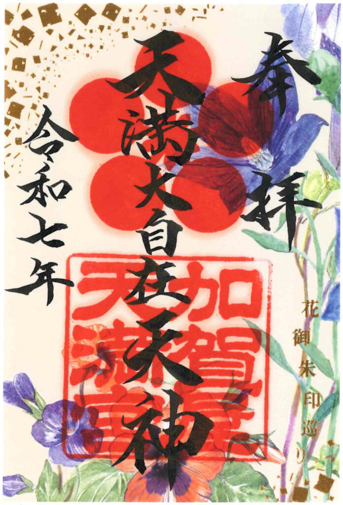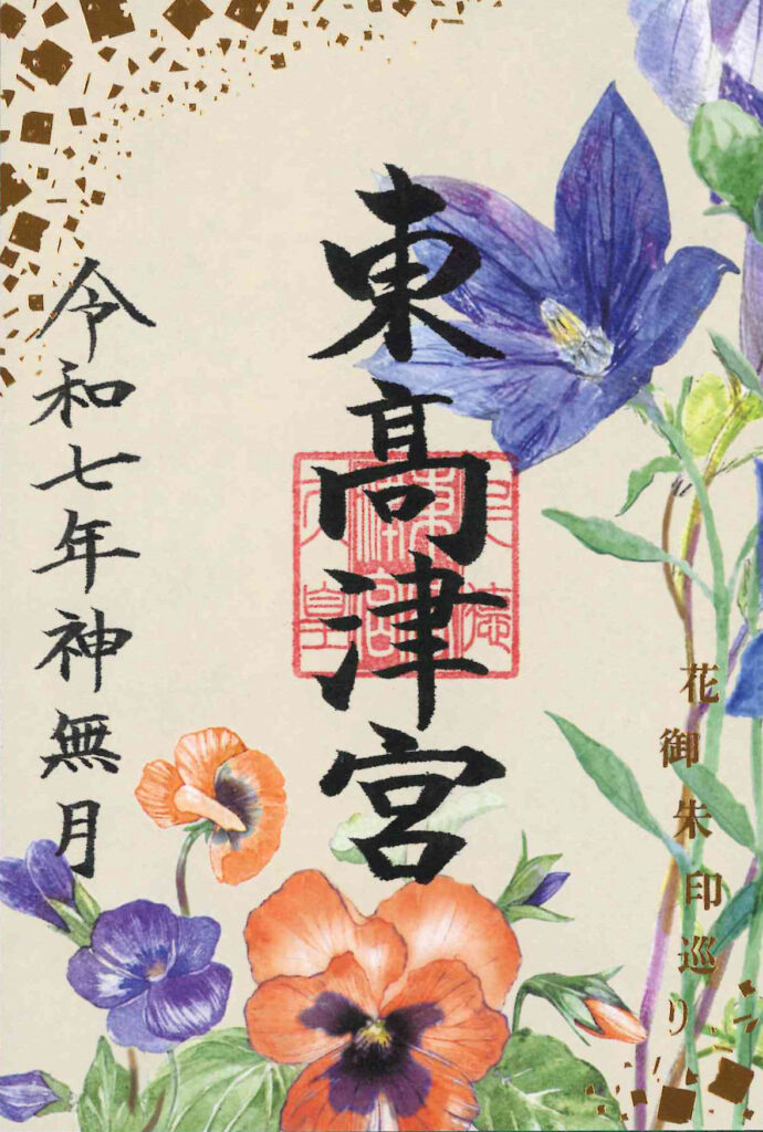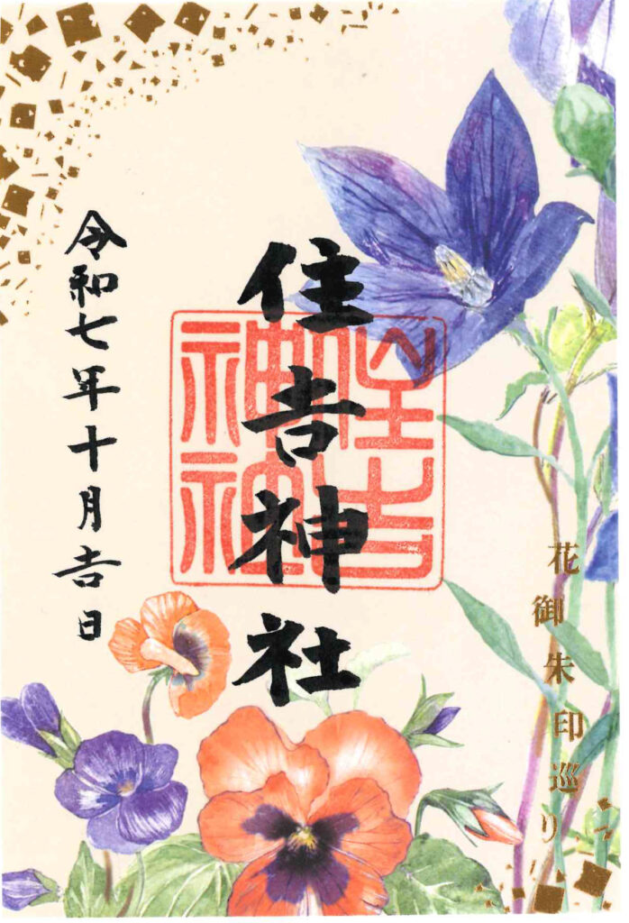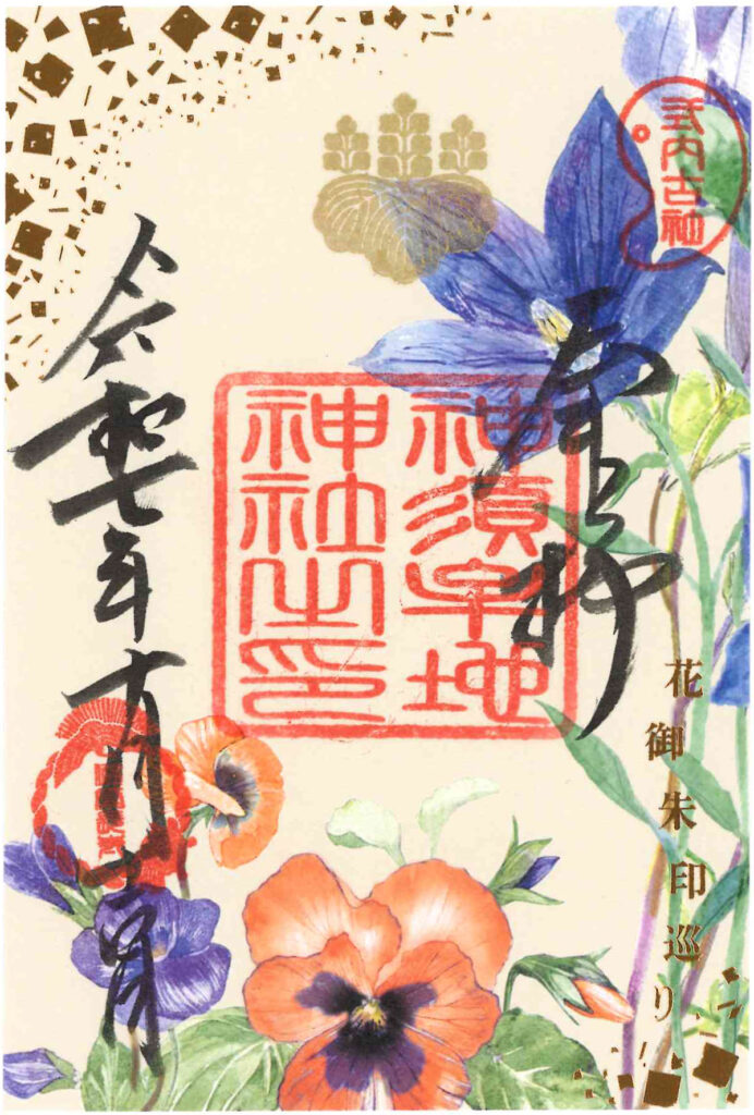 2つの花を組み合わせた、秋限定花御朱印は緑・茶・オレンジ・紫の秋色を基調に、金箔で“風の流れ”を表現した華やかな一枚。見る角度によってきらめきが変わりる台紙のデザインです。